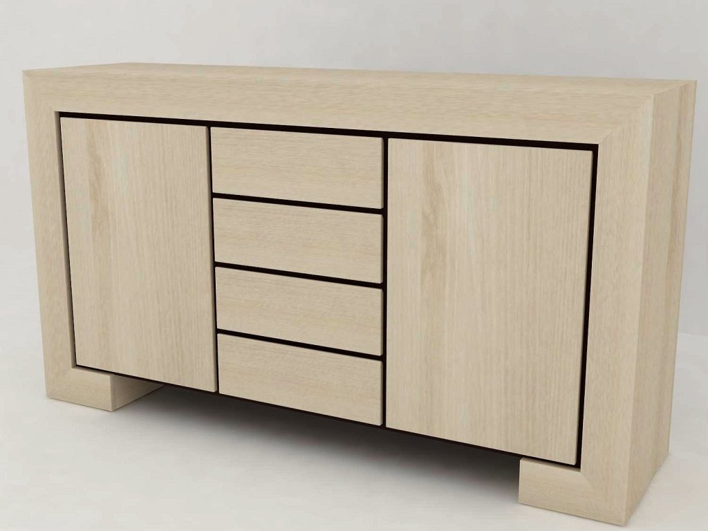 Moderní světlá komoda s výrazným širokým rámem. K využití jsou čtyři šuplíky a dvě boční skříňky.