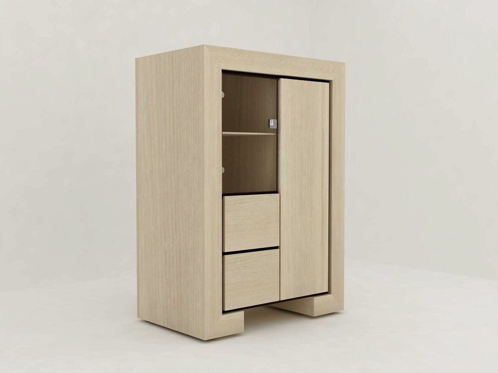 Větší úložná komoda se skvělým designem, sklěněnými dveřmi na jednom boku, dvěma šuplíky a dvířky na boku druhém. Na výběr ve světlém provedení dub/wenge. Možno zakoupit jako součást obývací sestavy či samostatně. Komoda je vyrobena z kvalitního lamina u kterého je výhodou stálost barev a snadná povrchová údržba.